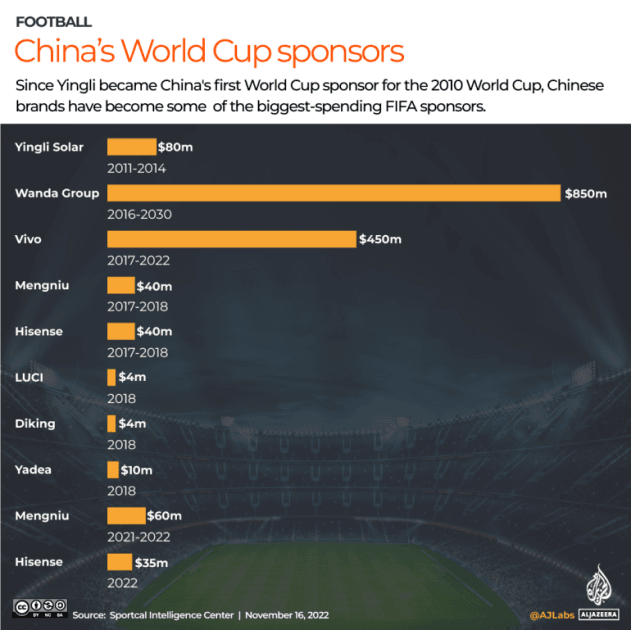 迄今為止,萬達(dá)集團(tuán)是卡塔爾世界杯最大的中國贊助商,萬達(dá)集團(tuán)承諾為世界杯投資8.5億美元(約合人民幣60億元),作為與FIFA協(xié)議的一部分。2016年,萬達(dá)集團(tuán)簽約成為了FIFA官方合作伙伴,協(xié)議時長為15年。