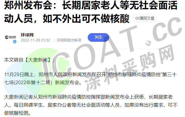 鄭州除高風險區外,長期居家老人、每日網課學生、居家辦公者等無社會面活動人員,如無出行需求,可不做核酸檢測。密切接觸者、高風險外溢人員、結束閉環作業的高風險從業人員、入境人員的核酸檢測,按照進一步優化防控工作的二十條措施執行,重點人員嚴格按照有關規定執行。