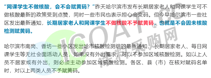哈爾濱市發布長期居家老人和網課學生可不做核酸的最新政策,長期居家老人和網課學生不做核酸不予賦黃碼,不會因未核酸檢測賦黃碼。