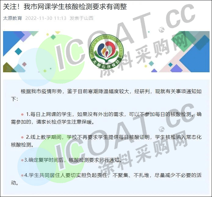 太原市每日上網課的學生,如果沒有外出的需求,可以不參加每日的核酸檢測。線上教學期間,學校不再要求學生提供每日核酸證明,學生核檢納入常態化核酸檢測。