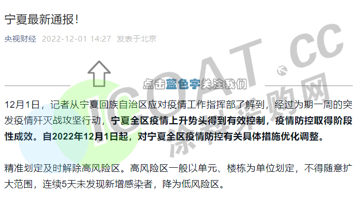自2022年12月1日起,對寧夏全區疫情防控有關具體措施優化調整。精準劃定及時解除高風險區。高風險區一般以單元、樓棟為單位劃定,不得隨意擴大范圍,連續5天未發現新增感染者,降為低風險區。取消低風險區人員流動限制??茖W有序開展核酸檢測。本輪疫情連續5天無新增社會面陽性人員檢出的縣(區、市)轉為常態化核酸檢測+重點人群核酸檢測。