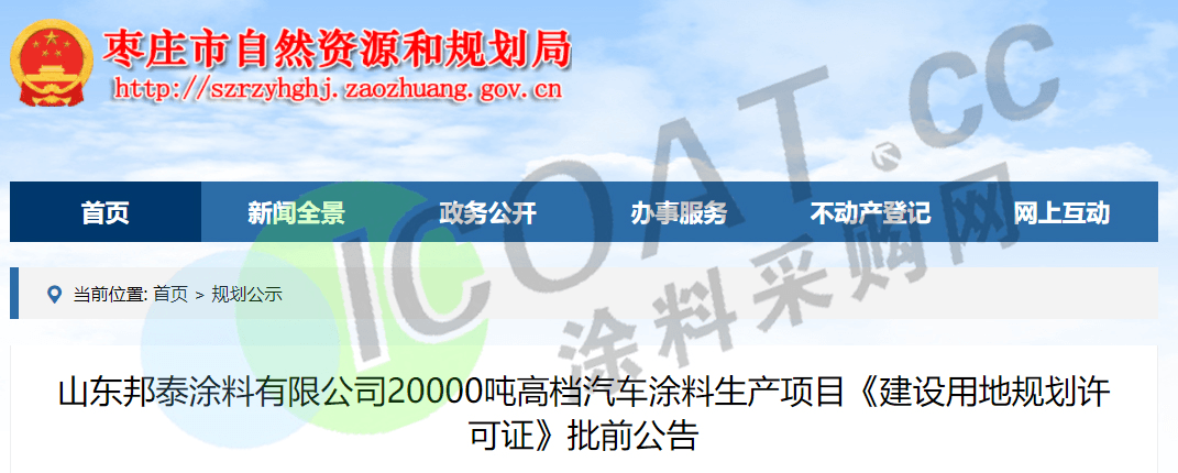 山東邦泰涂料20000噸高檔汽車涂料生產(chǎn)項(xiàng)目《建設(shè)用地規(guī)劃許可證》批前公告。