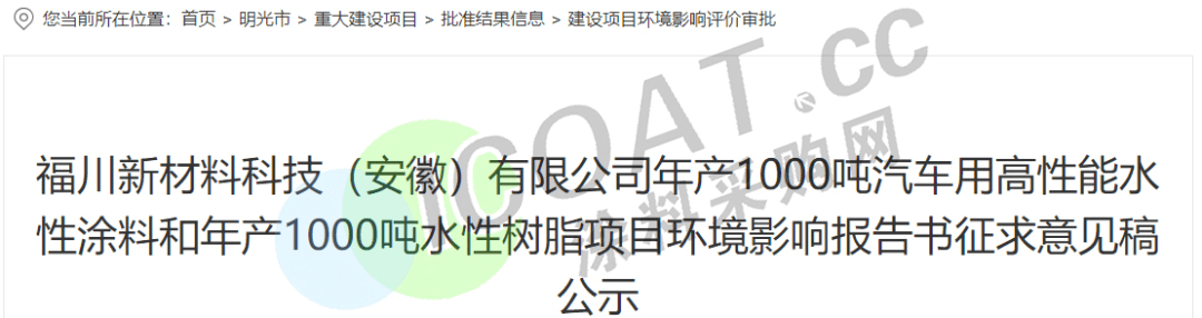福川新材料科技(安徽)年產(chǎn)1000噸汽車用高性能水性涂料和年產(chǎn)1000噸水性樹脂項(xiàng)目環(huán)境影響報(bào)告書征求意見稿公示。