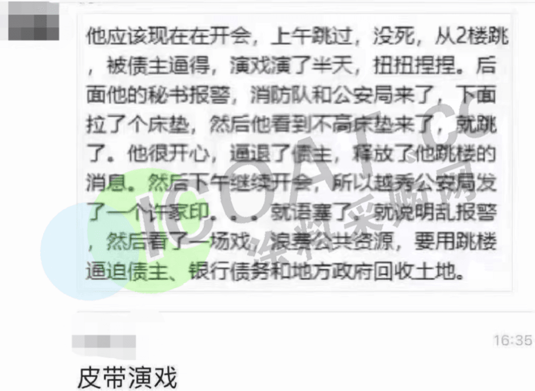關于跳樓傳言,有人說是從2樓跳的,拉了個床墊毫無危險;也有人說是從19樓跳的,被消防接住了。但共同點都是“一切都好”。許家印作為目前中國“首負”,正在變著法兒地搞錢,這一屁股債的壓力下,如果他要跳樓,一群債主將趕過來救他。