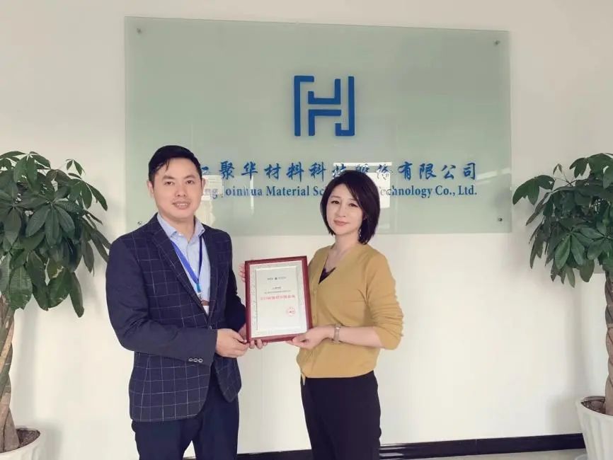 涂料采購網(wǎng)市場部總監(jiān)張馨元(右)與聚華材料董事長張慶華(左)合影