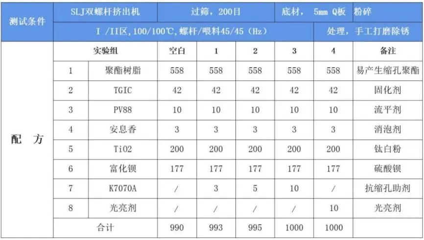 研發人員經過多番實驗驗證了K7070A具有良好的抗縮孔性能,而且對于粉末其他性能幾乎沒有影響。科研的魅力在于不斷探索,隨之而來的是研發人員產生了新的疑問即:添加了K7070A的粉末涂料,會不會對其他未添加K7070A的粉末涂料或者添加光亮劑的粉末涂料產生影響呢?為了解開迷津他們進一步設計了獨特的實驗思路,探究K7070A能否與空白粉末、光亮劑“和平共處”。