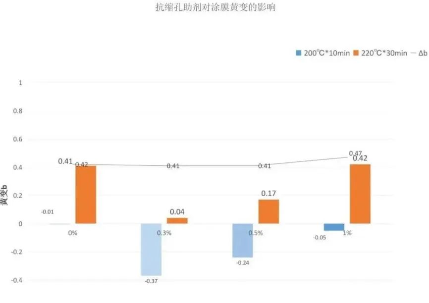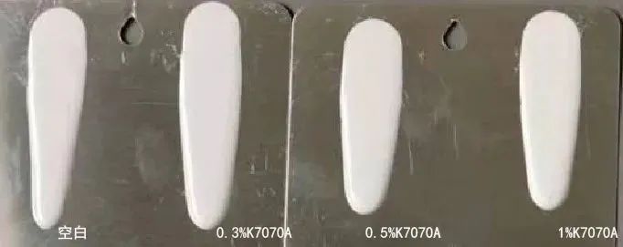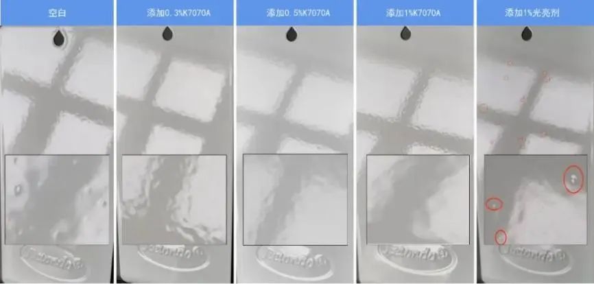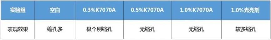 考慮到普通的低成本聚酯在應用過程中容易出現縮孔、針孔,捷通達的研發人員以此類樹脂作為實驗基料考查K7070A的抗縮孔性能。實驗結果顯示,當科研人員把K7070A的添加量0.3%調整為0.5%時,縮孔逐漸消失,表觀效果優異。此外,添加1.0%的K7070A相較于添加等量的光亮劑,縮孔問題可以被完全解決。