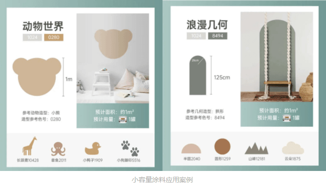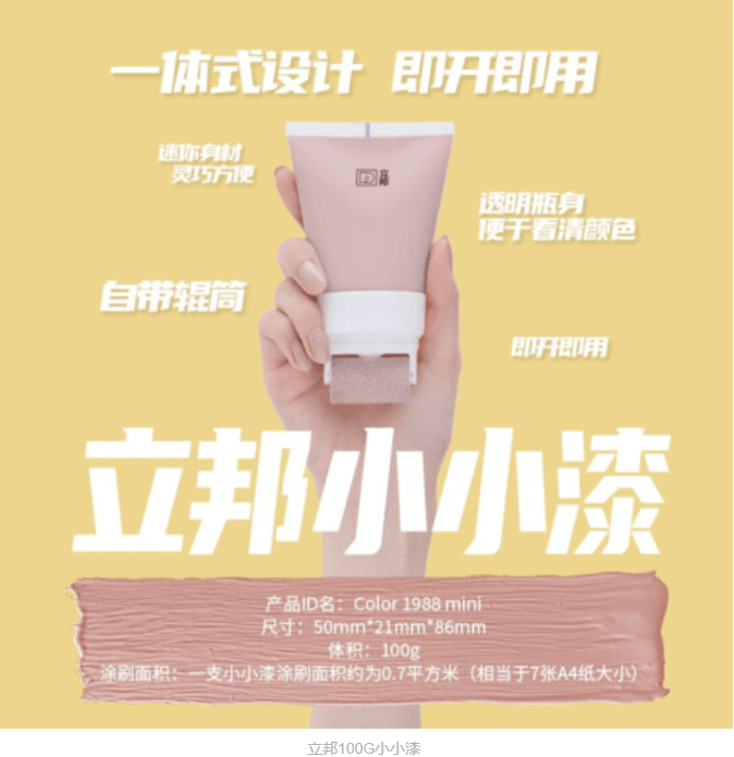 立邦100G小小漆數(shù)據(jù)顯示,0.5L的小罐漆可涂刷3個平米,可以滿足時換時新的需求,也可以進行局部修補,同時也打破了多年來涂料的涂刷必須由專業(yè)人員施工的限制,滿足了C端用戶的需求。