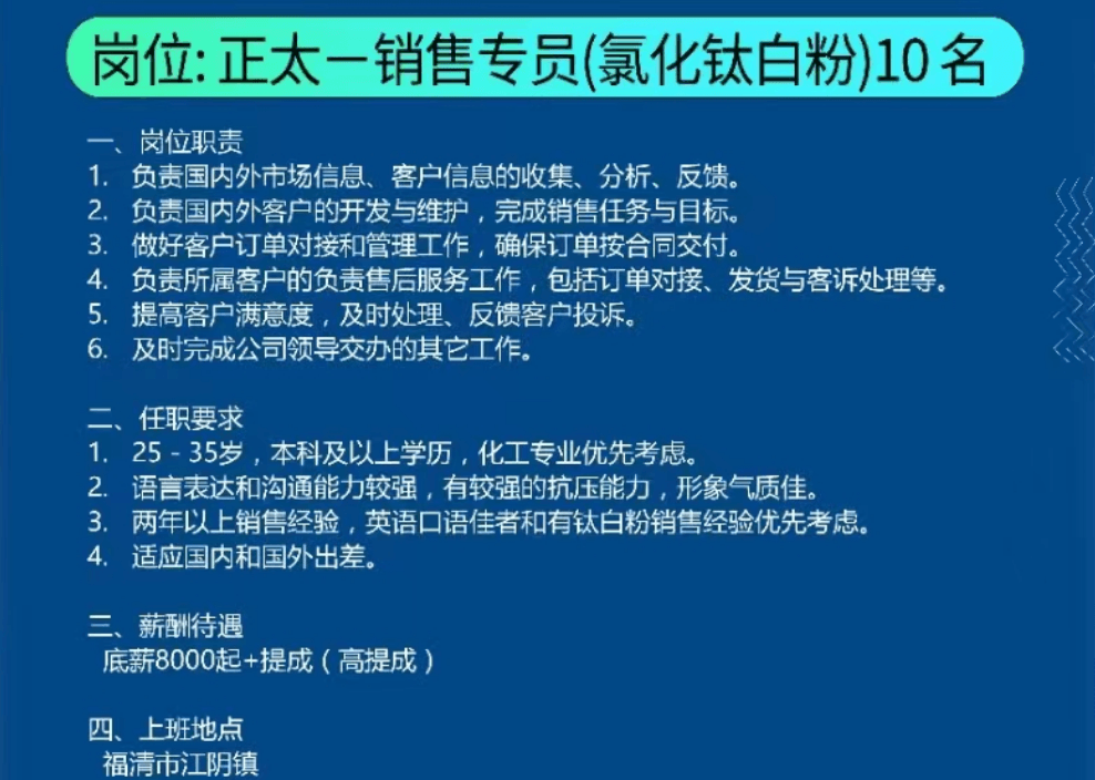 近日,福建坤彩材料科技股份有限公司(上證:603826)發(fā)布招聘啟事,誠(chéng)聘氯化鈦白粉銷售專員10名,氧化鐵銷售專員10名,底薪8000元起,并提供高額提成,待遇優(yōu)渥,歡迎有才之士加盟。