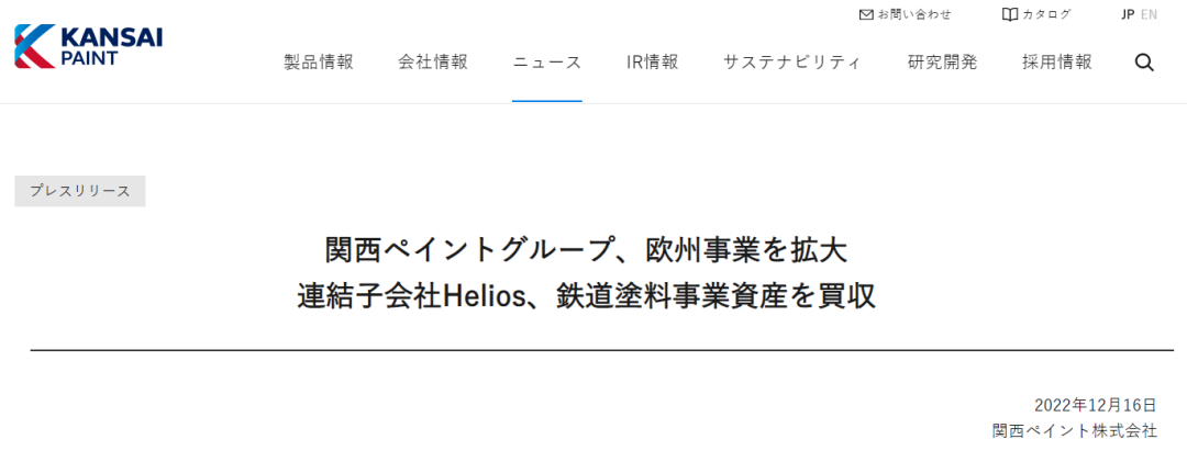 該交易于2022年11月30日首次以“關于收購歐洲一家粉末涂料業務公司(使其成為合并子公司)股份的通知”的形式公布。Kansai Helios收購了CWS的所有股份,并成為其新所有者。