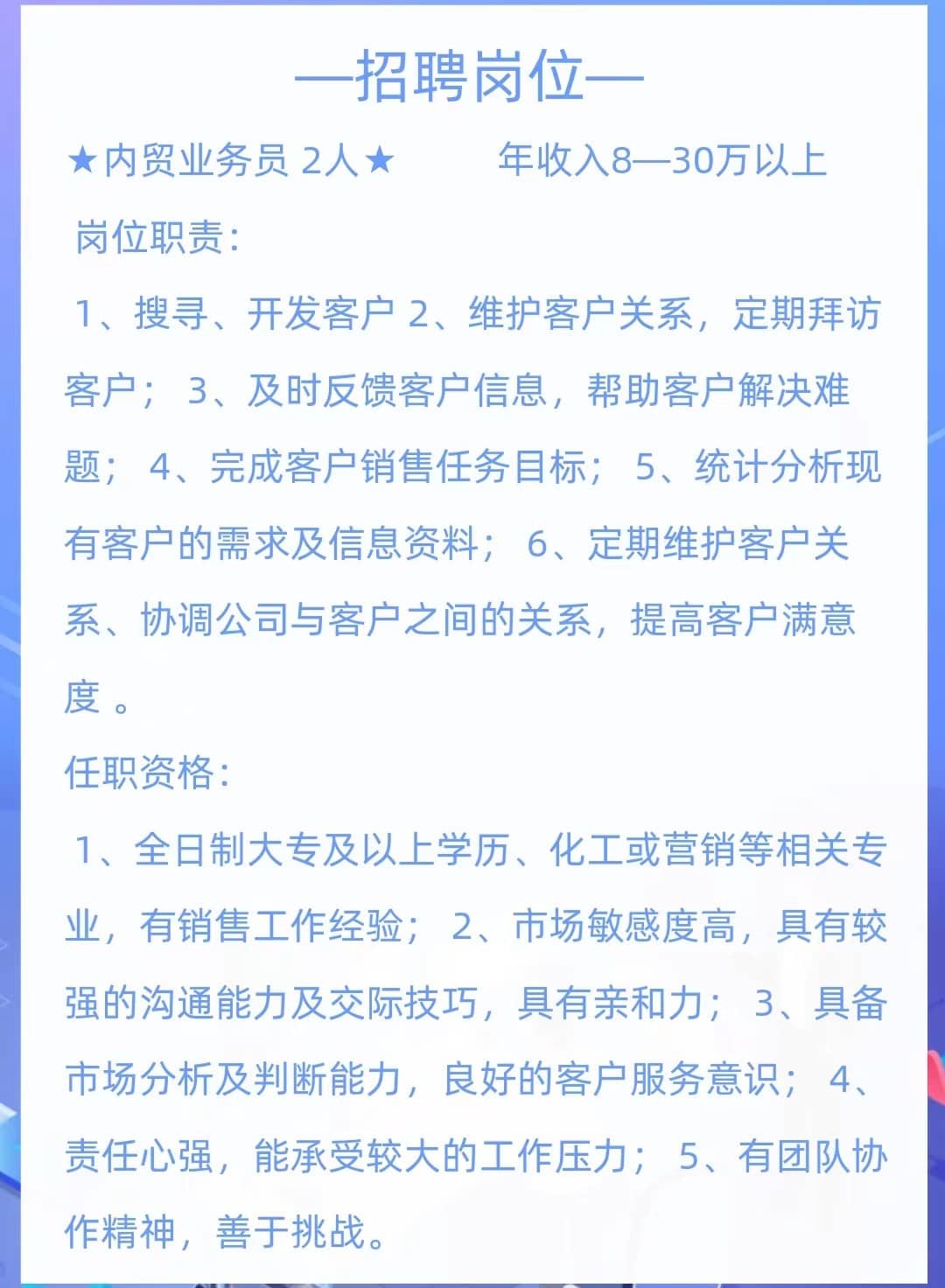 近日,江蘇泛華化學科技有限公司發布招聘啟事,招聘內貿業務員 2人、檢測工程師 2人。
