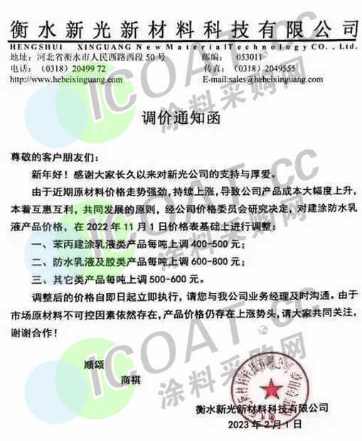 在溶劑行業(yè),純苯、甲苯、二甲苯、環(huán)己酮等原材料也在年內(nèi)出現(xiàn)上漲的情況,漲幅在10%左右。乳液三巨頭的漲價(jià)也于2月初安排妥當(dāng),衡水新光苯丙建涂乳液類上調(diào)400-500元/噸,防水乳液及膠類上調(diào)600-800元/噸,其它類上調(diào)500-600元/噸;保立佳對(duì)建筑事業(yè)部推廣產(chǎn)品價(jià)格做不同程度的上調(diào),具體價(jià)格實(shí)行“一單一議”政策;巴德富對(duì)產(chǎn)品價(jià)格進(jìn)行調(diào)整,決議原則上不再接受長(zhǎng)周期訂單積壓行為。
