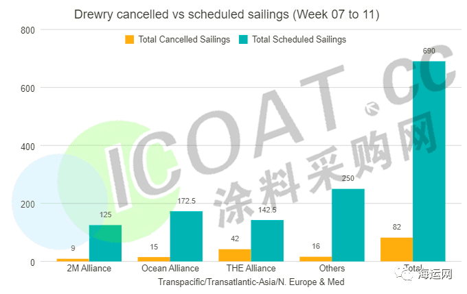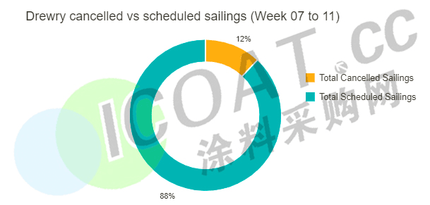 為應對需求不足,2023年前七周,集運公司在亞歐線削減了27%的運力。在跨太平洋、跨大西洋和亞洲至北歐和地中海的主要貿易航線的總共690個預定航次中,在第7周(2月13日至19日)到第11周(3月13日至19日)的5周間取消了82個航次,取消率占12%。