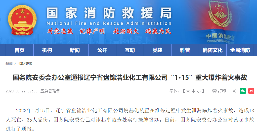 1月15日,遼寧省盤錦浩業化工有限公司烷基化裝置在維修過程中發生泄漏爆炸著火事故,造成13人死亡、35人受傷。國務院安委會已對該起事故查處實行掛牌督辦,國務院安委會辦公室對該起事故進行了通報。