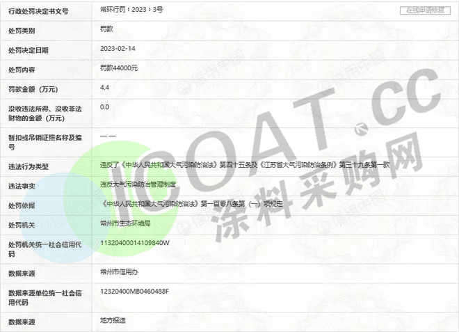 江蘇大使同豐涂料有限公司因違反了《中華人民共和國大氣污染防治法》第四十五條及《江蘇省大氣污染防治條例》第三十九條第一款,被處罰4.4萬元。