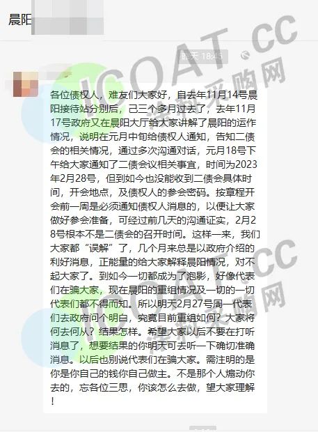 繼去年11月中旬晨陽領(lǐng)導(dǎo)小組辦公室發(fā)布了《關(guān)于晨陽問題的有關(guān)答復(fù)》(點擊查看詳情),并公布“初定1月中旬正式向債權(quán)人發(fā)送債權(quán)人會議相關(guān)通知”的消息后,數(shù)千債權(quán)人一直在關(guān)注相關(guān)信息。有不少人質(zhì)疑,1月中旬正值小年前后,大家忙著張羅過年的事情,是不是會把這件事情延期。