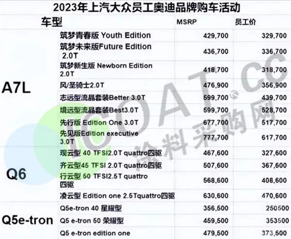 上汽大眾流傳于網絡上的《2023年上汽大眾員工奧迪品牌購車活動》的圖片,奧迪旗下在售的三款產品(A7L、Q6L、Q5 e-tron)給出了員工購車價,優惠區間在7萬-16萬元,這也就意味著不到33萬購買一臺奧迪A7L。