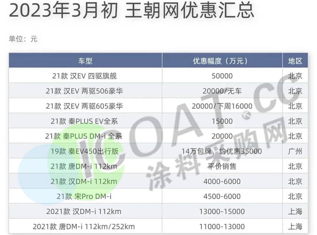 比亞迪:2021款 漢EV 四驅旗艦版車型折現金優惠5萬,2021款 漢EV 506/605km現金優惠1.6萬-2萬;秦PLUS EV全系優惠1.5萬,老款秦PLUS DM-i現車優惠2萬元。秦EV 450出行版在部分地區推出“14萬包牌包運營證”活動,綜合優惠超3.5萬元。