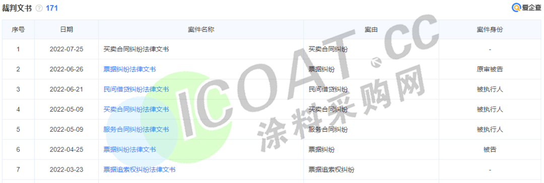 網絡部平臺顯示,晨陽水漆裁判文書涉及171項,僅2022年內就有7項,其中包括買賣合同糾紛、票據糾紛、民間借貸糾紛、服務合同糾紛、票據追索權糾紛、財產保險合同糾紛等。