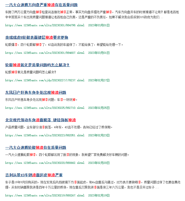 除此之外,在網絡平臺不少消費者投訴,多個知名品牌汽車掉漆、爆漆,但反饋無效,希望得到重視和處理。還有不少車主集體維權,希望廠家能給一個合理的解決方案。