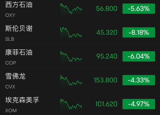 油價周內累計跌超10%,能源股也受拖累全線下跌,埃克森美孚跌4.97%,雪佛龍跌4.33%,康菲石油跌6.04%,斯倫貝謝跌8.18%,西方石油跌5.63%。