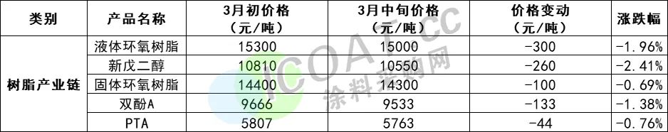 涂料采購網注意到,3月以來跌價的部分化工原材料同時也是涂料產業鏈重要組成之一,例如樹脂產業鏈,液體、固體環氧樹脂價格分別下跌300元/噸、100元/噸,跌幅在1%左右,新戊二醇價格下跌260元/噸,PTA價格下跌44元/噸。
