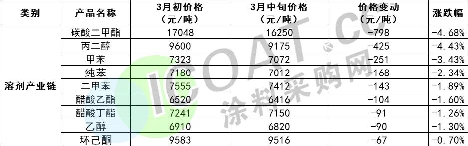 溶劑產業鏈方面,碳酸二甲酯價格下跌798元/噸,丙二醇價格下跌425元/噸,跌幅均在4%左右,甲苯、純苯、二甲苯、醋酸乙酯等原材料的價格也出現了不同程度的下跌。