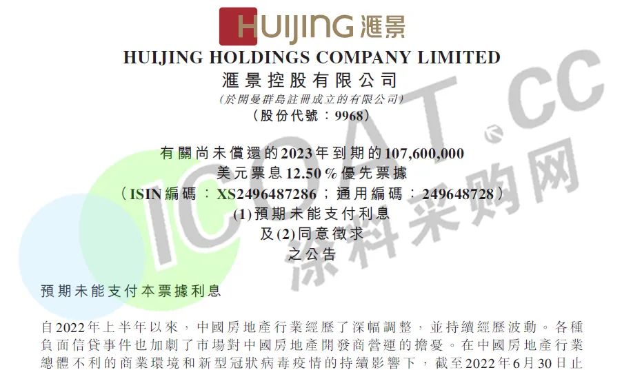 匯景控股:預(yù)期未能償還2023年到期1.08億元12.50%優(yōu)先票據(jù)利息。