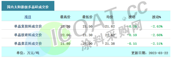 單晶復投料成交價21.50-22.20萬元/噸,平均為21.82萬元/噸,均價下降2.63%。