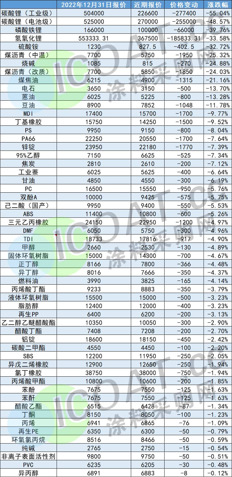 涂料采購網(wǎng)信息庫數(shù)據(jù)顯示,自2022年12月31日至2023年一季度末,共50多種化工品價(jià)格下跌,其中不乏新能源產(chǎn)業(yè)鏈上的鋰系化工品,噸價(jià)下跌逾27萬,跌幅超過55%。