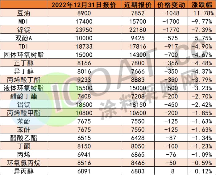 2023年一季度涂料產(chǎn)業(yè)鏈化工原料降幅榜(單位:元/噸)