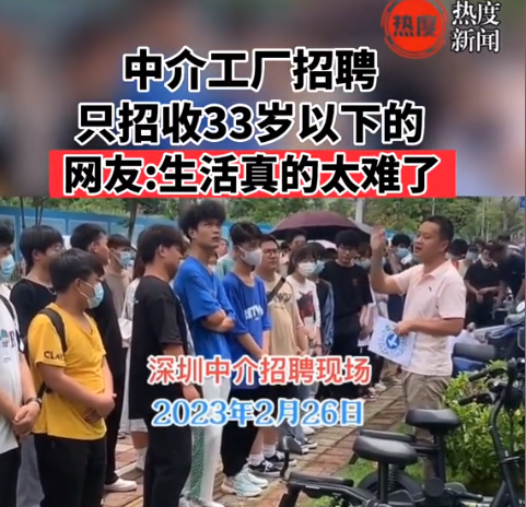 制造業(yè)工廠(chǎng)的冷淡也影響到了歷年春節(jié)后金三銀四的招工大戲,廣東深圳某工廠(chǎng)表示招工不招86年以上(1986年以前出生)的員工,門(mén)口還用大喇叭高喊著“86年以上的可以離開(kāi)了,不用排隊(duì)了”。