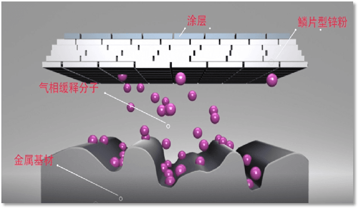 VCI涂層為何得到國家及市場的廣泛認可?這得益于VCI涂層使用片狀鋅粉來代替熱浸鍍鋅的球狀鋅粉,其平行搭接結構提高了涂層的屏蔽性能。同時結合VCI氣相緩蝕劑提供致密性封閉膜,使得鋅粉間電阻率小,電化學保護作用強,腐蝕防護性能極佳。