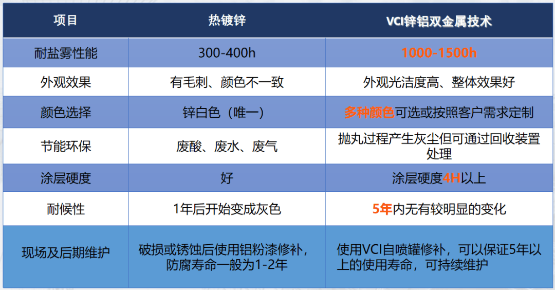 據中航新材研發人員介紹,在技術優勢上,相較于傳統熱鍍鋅工藝,VCI涂層防腐蝕效率更高,效果更好,配合自動化生產工藝,生產效率高,保障施工進度。同時,VCI涂層采用常溫噴涂固化或低溫固化,低能耗、低污染、低成本,大幅度減少生產過程中的碳排放。