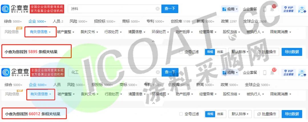 據企查查平臺數據,有失信信息的涂料企業就超過5800家,化工企業超過66000家。