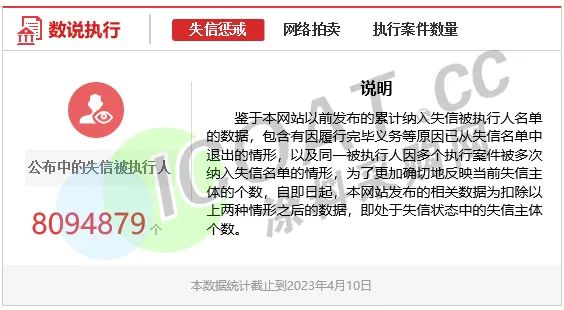 據公開數據,截至2023年4月1日,中國執行信息公開網公布的失信被執行人已經超過800萬人,與2020年同期數據相比增加了230萬人,增幅超過40%。
