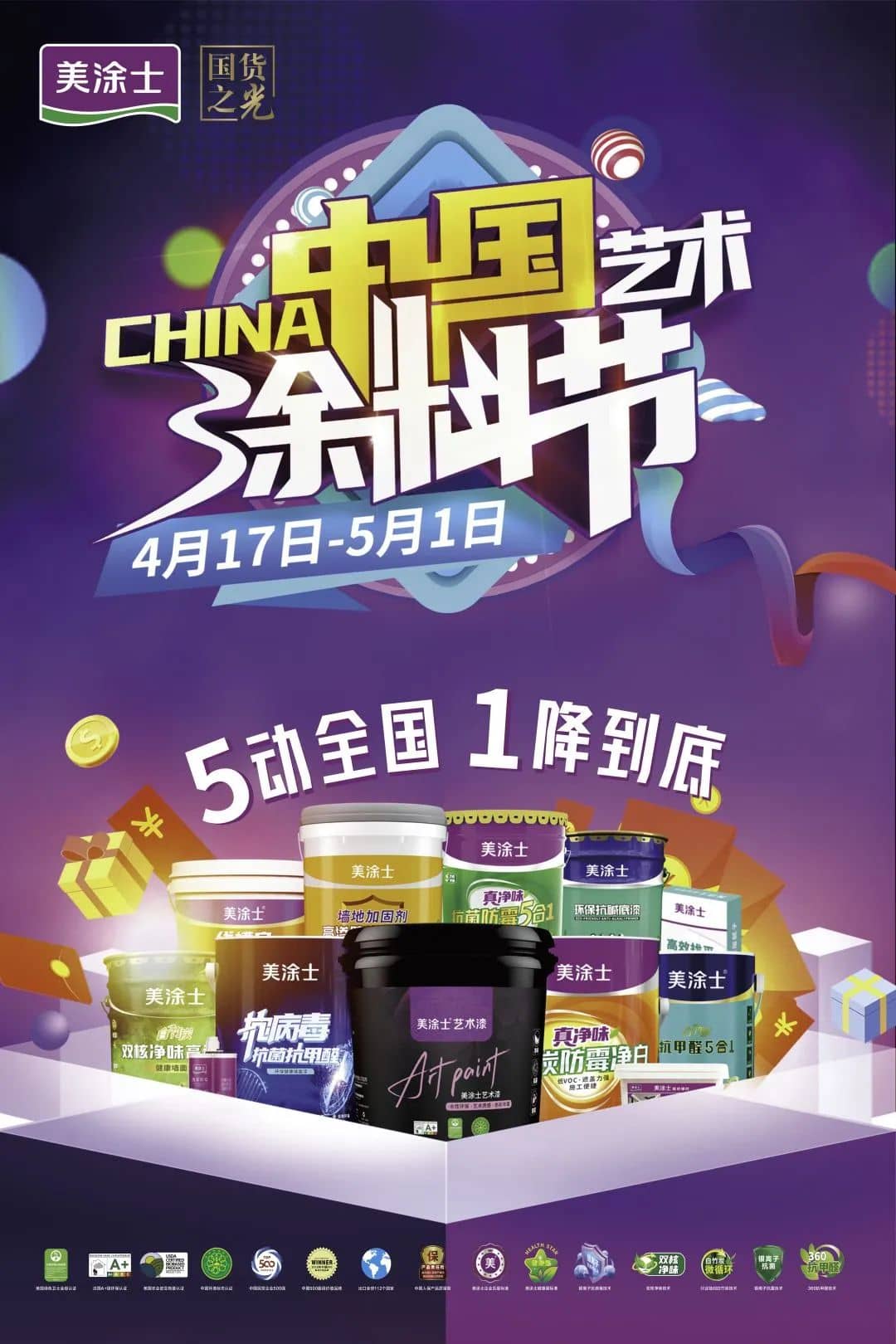 本次涂料節與往年一樣繼續覆蓋全國各地,相關優惠政策全面統一放開,為全國的消費者展示廠家讓利補貼的誠意,以及多重豪禮現定現送!在給到消費者真切讓利的同時,用豐富個性化的綠色產品選擇,高品質健康涂料產品、涂裝服務及解決方案,良好地滿足消費者對美好家居生活的向往。