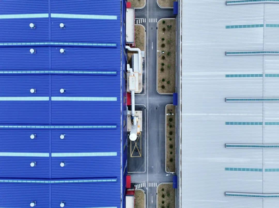 色彩上,設計團隊選擇了嘉寶莉的紅藍色logo和灰色、白色作為主要色調,來控制整個廠區的色彩呈現。兩個倉庫的外立面均使用灰色,生產工廠的主色調為藍色,研發中心則使用白色,并以紅、藍色彩點綴其間。