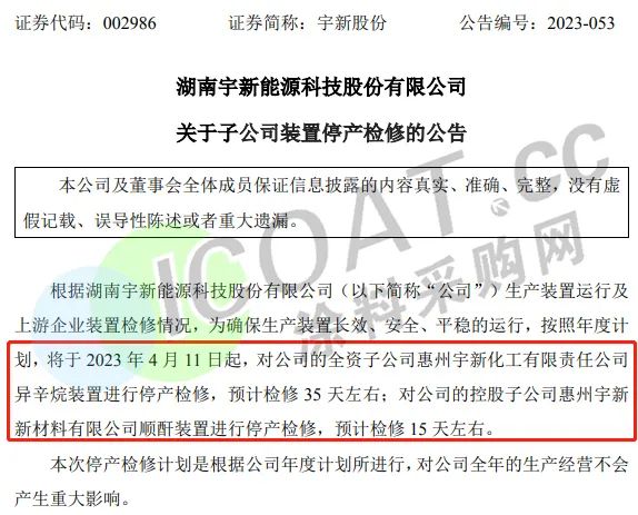 宇新股份公告,按照年度計劃,將于4月11日起,對公司全資子公司惠州宇新化工異辛烷裝置進行停產(chǎn)檢修,預(yù)計檢修35天左右;對公司控股子公司惠州宇新新材料順酐裝置進行停產(chǎn)檢修,預(yù)計檢修15天左右。