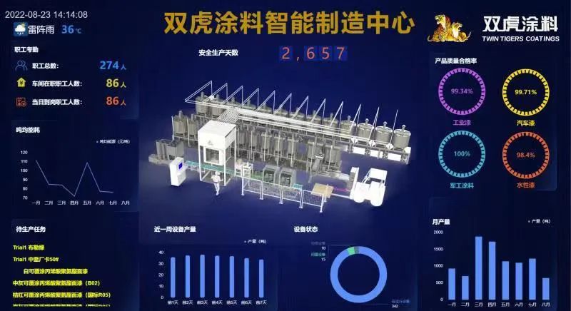 多年來,雙虎涂料不斷奮進,產品系列齊全,涵蓋18個系列,超過3200多個品種,不僅擁有全套質量體系,還有IATF16949汽車體系認證,中國船級社(CCS)認證、CRCC鐵路產品認證、AS9120航空航天認證。產品類別涉及工業防腐涂料、普通防腐涂料、汽車電泳漆、軍工涂料以及各種水性工業涂料。截止目前,雙虎涂料擁有國家發明專利29項、63項高新技術產品通過鑒定,承擔國家火炬項目2項、4項省市重點項目,主持(參與)起草國家標準8項。本系統不僅很好地助力了雙虎涂料經營質量提升,同時在湖北省涂料行業也是一個樣板工程,雙虎涂料將以此為樣板,持續復制本生產線來升級其他生產車間,全面提升雙虎涂料的智能化制造水平,持續助力企業的高質量發展。雙虎涂料為進一步把握發展機遇,在以“聚焦防腐,軍民兩用,涂裝一體”的戰略規劃指引下,以“產學研策保研發、智能制造保交付”的經營策略來賦能企業高質量發展,底漆、中涂實現體系標準化生產,各類、各色、多批量的面漆通過智能制造來解決,全方位解決個性化涂料配套體系難題。