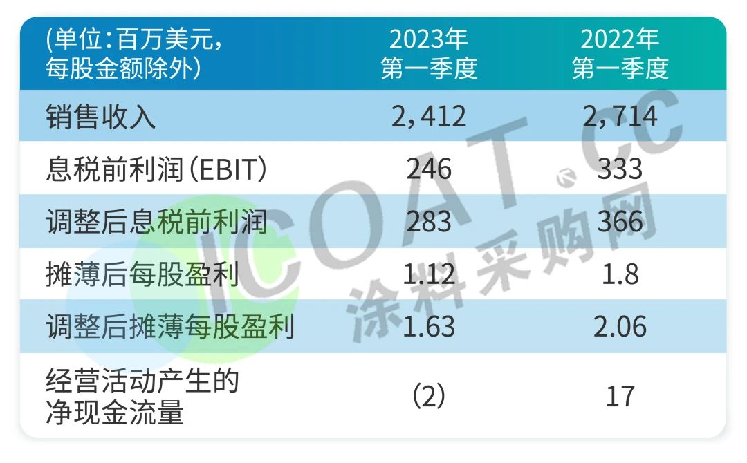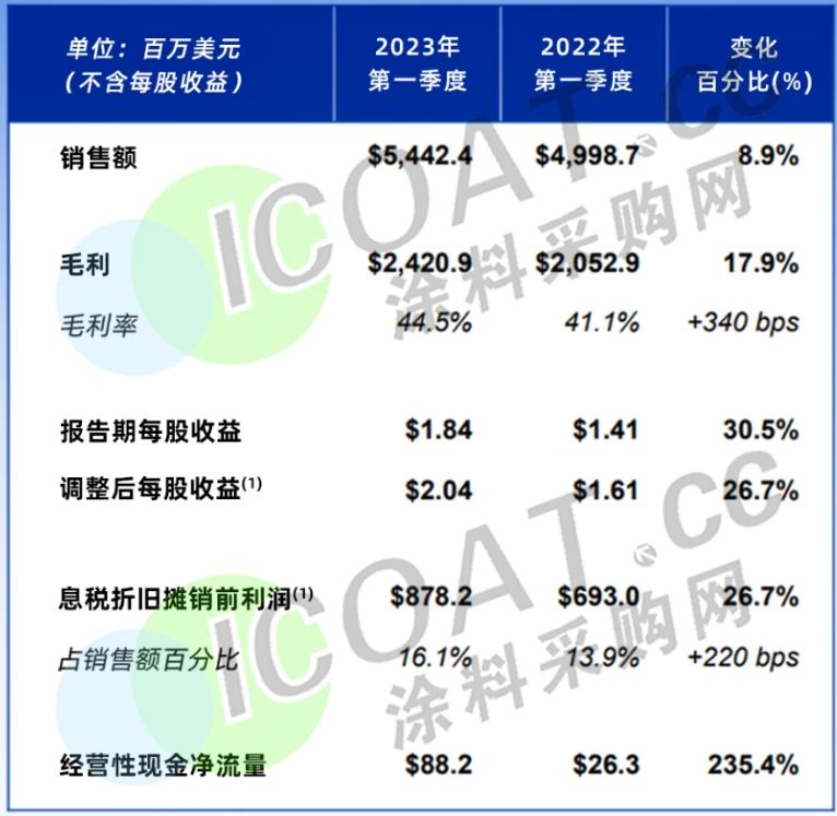 PPG一季度實現創紀錄的凈銷售額43.8億美元(約合人民幣302億元),同比增長2%;凈利潤暴增1367%至2.64億美元(約合人民幣18億元);在銷售價格上漲的帶動下,企業有機銷售額較上年增長5%以上。供應中斷緩解,生產經營改善,經營性現金流同比增長約4億美元(約合人民幣27億元)。