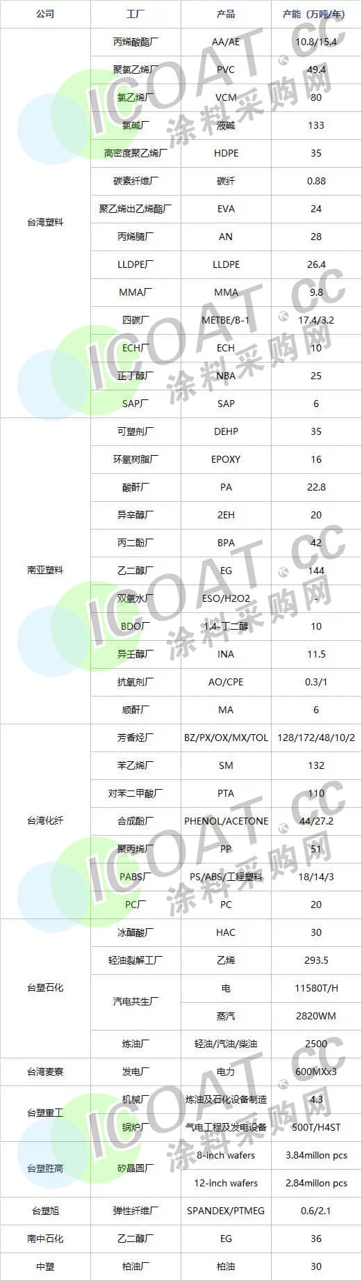 臺(tái)塑是中國(guó)臺(tái)灣省最大的煉化一體化企業(yè),已經(jīng)形成了完善的產(chǎn)業(yè)鏈結(jié)構(gòu),并且臺(tái)塑在中國(guó)內(nèi)地也建立了多個(gè)工廠。臺(tái)塑包括的企業(yè)有:臺(tái)塑化學(xué)、南亞塑膠、臺(tái)化、臺(tái)塑石化、臺(tái)朔重工、臺(tái)灣小松電子、南亞科技等。包括的產(chǎn)品有:丙烯酸及酯、聚氯乙烯、氯堿、聚乙烯、碳素纖維、聚乙烯醇醋酸乙烯酯、環(huán)氧氯丙烷、正丁醇、辛醇、對(duì)二甲苯、乙二醇、純苯、苯乙烯、聚丙烯、甲醇及尿素等。