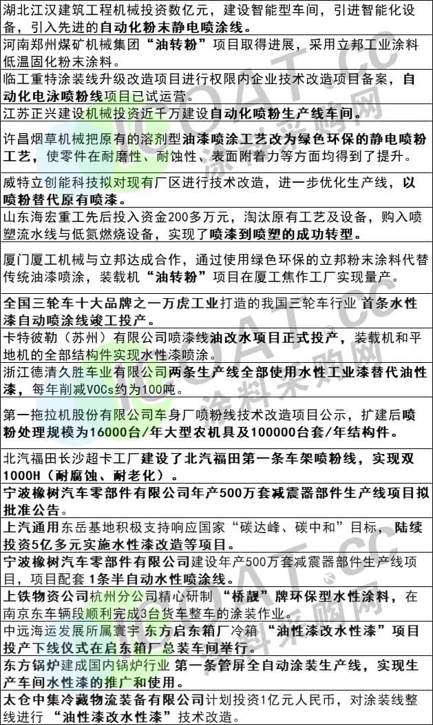國家機關部委和各地區“禁油令”的腳步陸續跟進,并且對于環保型涂料產業鏈的企業給予一定的支持和扶持,也是為了能夠給本地區的生態環境交出亮眼的答卷,這無疑也給工程機械、集裝箱、汽車等工業領域指引了新的方向,“油改水”、“漆改粉”成為大勢所趨。