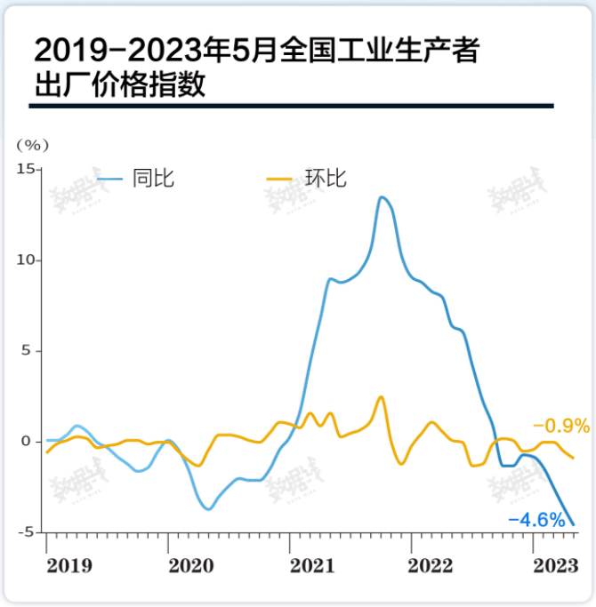 這種對于大客戶流失的擔憂,也讓整個化工行業如同熱鍋上的螞蟻,焦灼難耐。這種擔憂并不是空穴來風,根據國家統計局公布的數據可知,2023年5月份,全國工業生產者出廠價格PPI同比下降4.6%,為2016年2月以來最大降幅。環比下降0.9%,降幅已連續2個月擴大。截至5月,我國PPI同比已連續8個月負增長。