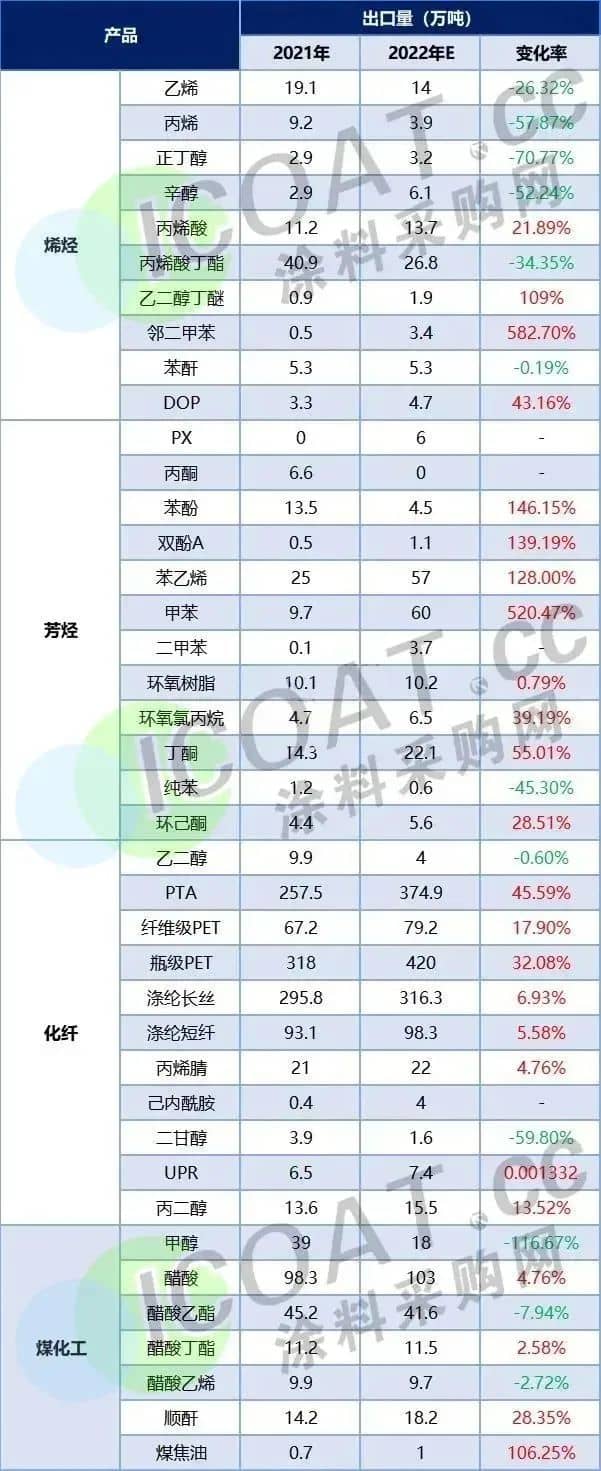 而在化工領(lǐng)域,也有不少烯烴類、芳烴類、化纖類和煤化工類產(chǎn)品依賴出口外貿(mào)進(jìn)行銷售,2022年累計(jì)出口超過(guò)1700萬(wàn)噸。PTA、PET、滌綸長(zhǎng)絲的出口量均超過(guò)100萬(wàn)噸。乙烯、丙烯、正丙酮、辛醇、丙烯酸丁酯、苯酐、乙二醇、純苯、二甘醇、醋酸乙酯、醋酸乙烯等化工品出口量同比呈現(xiàn)減少態(tài)勢(shì)。