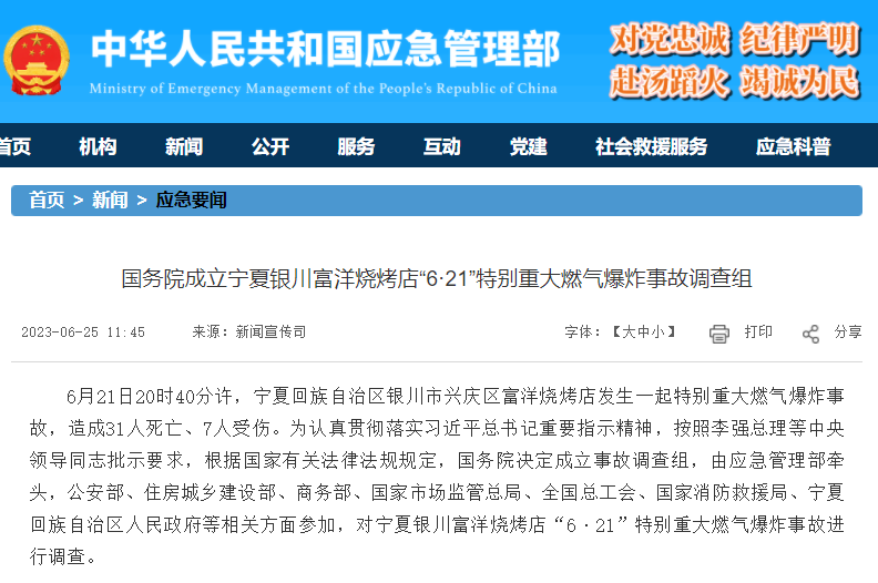 近日,應(yīng)急管理部發(fā)布消息,對于6月21日寧夏銀川興慶富洋燒烤店發(fā)生的特別重大燃?xì)獗ㄊ鹿剩?strong>國務(wù)院決定成立事故調(diào)查組,由應(yīng)急管理部牽頭,公安部、住房城鄉(xiāng)建設(shè)部、商務(wù)部、國家市場監(jiān)管總局、全國總工會、國家消防救援局、寧夏回族自治區(qū)人民政府等相關(guān)方面參加,對寧夏銀川富洋燒烤店“6·21”特別重大燃?xì)獗ㄊ鹿蔬M(jìn)行調(diào)查。