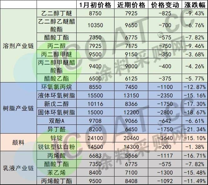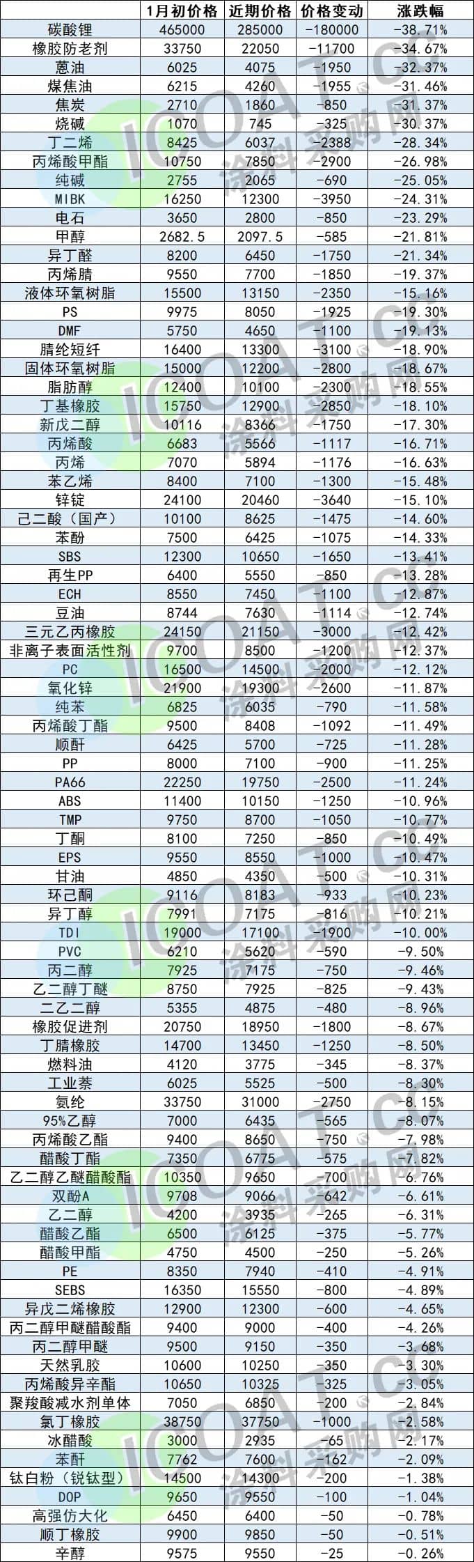 涂料采購網注意到,年初至今,80多種化工品價格下挫,其中碳酸鋰、煤焦油、焦炭、燒堿等化工品跌幅超30%,丁二烯、純堿、MIBK、甲醇、異丁醇等化工品跌幅超過20%,丙烯、苯酚、ABS、順酐等30多種化工品跌幅超過10%,另有丙二醇、醋酸丁酯、醋酸乙酯、丙烯酸乙酯等30多種化工品跌幅在10%以下。