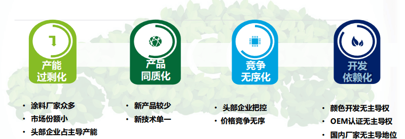 但與此同時,輪轂涂料行業也存在著產能過剩化、產品同質化、競爭無序化、開發依賴化的四大桎梏。事實上,這些問題也是整個涂料行業的共同痛點,由于行業集中度低,雖然涂料企業數量眾多但市場份額較小,頭部企業掌握了大半個市場,這也就造成了新品減少、技術單一,沒有良性競爭。