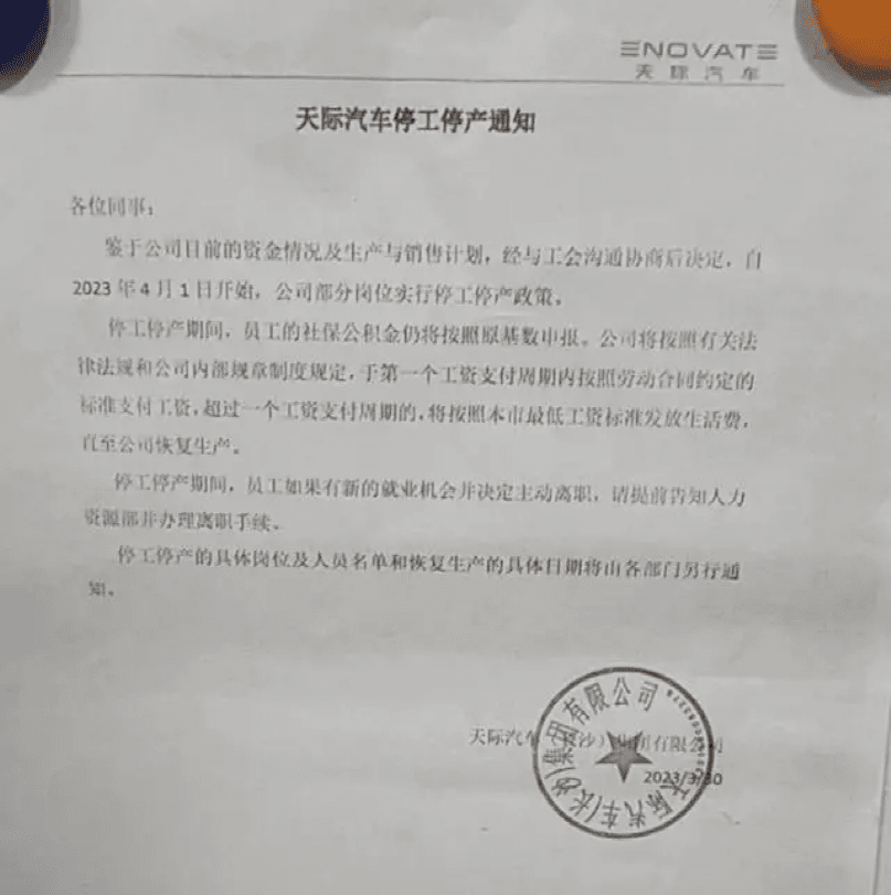 發布停工停產通知,鑒于公司目前的資金情況及生產與銷售計劃,自2023年4月1日開始,部分崗位實行停工停產政策。內部人員表示,而在正式停工之前,該企業其實已經連續數月拖欠工資。