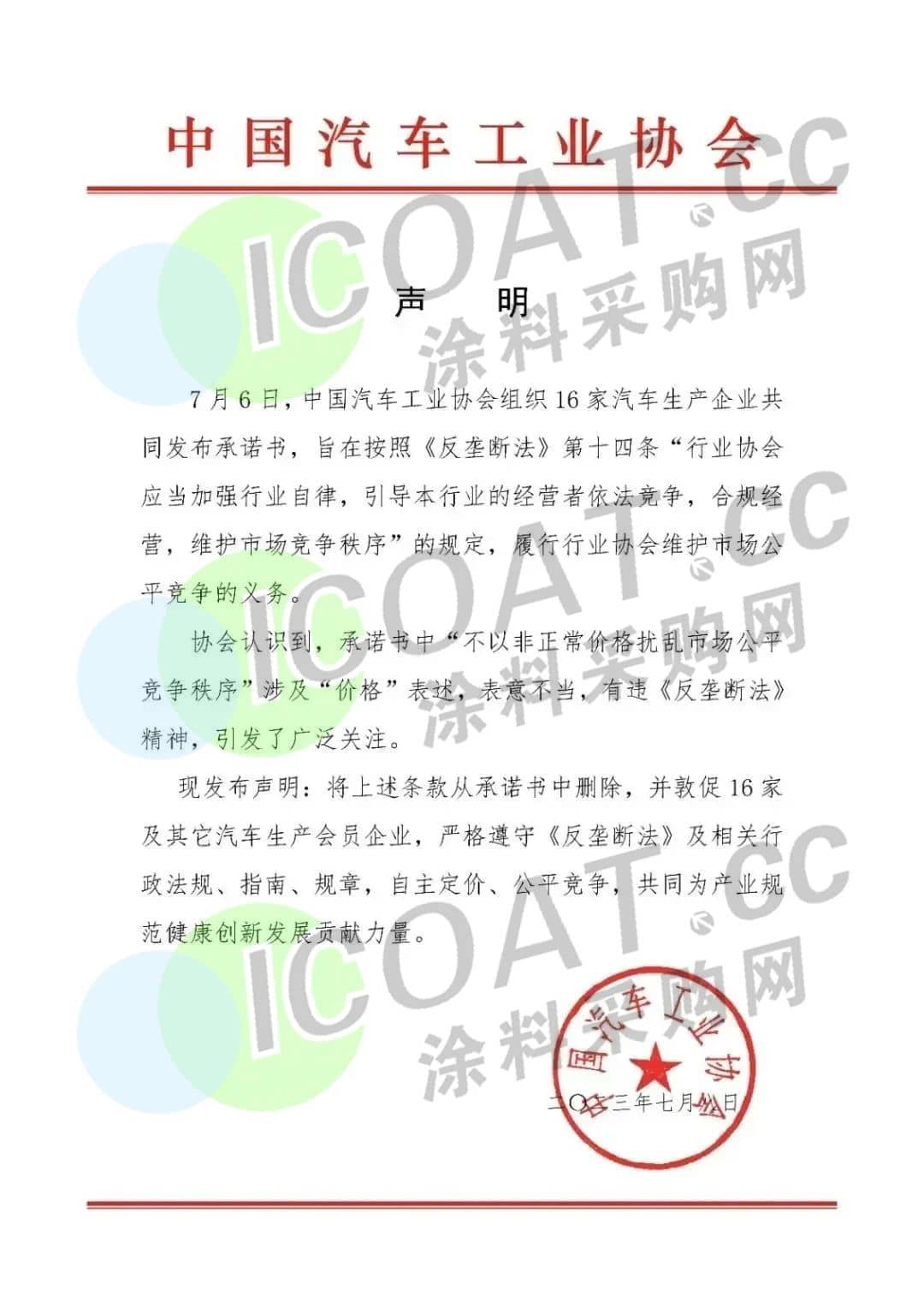 值得注意的是,發布僅48小時,中國汽車工業協會就 “反悔”改口了。昨日(8日),協會發布聲明稱,7月6日,中國汽車協會組織16家汽車生產企業共同發布的承諾書中,“不以非正常價格擾亂市場公平競爭秩序”涉及“價格”表述,表意不當,有違《反壟斷法》精神。聲明稱,現將上述條款從承諾書中刪除。
